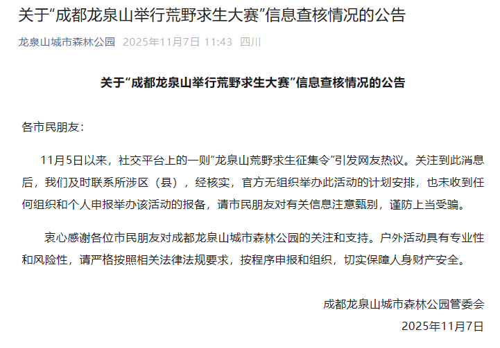 关于“成都龙泉山举行荒野求生大赛”信息查核情况的公告