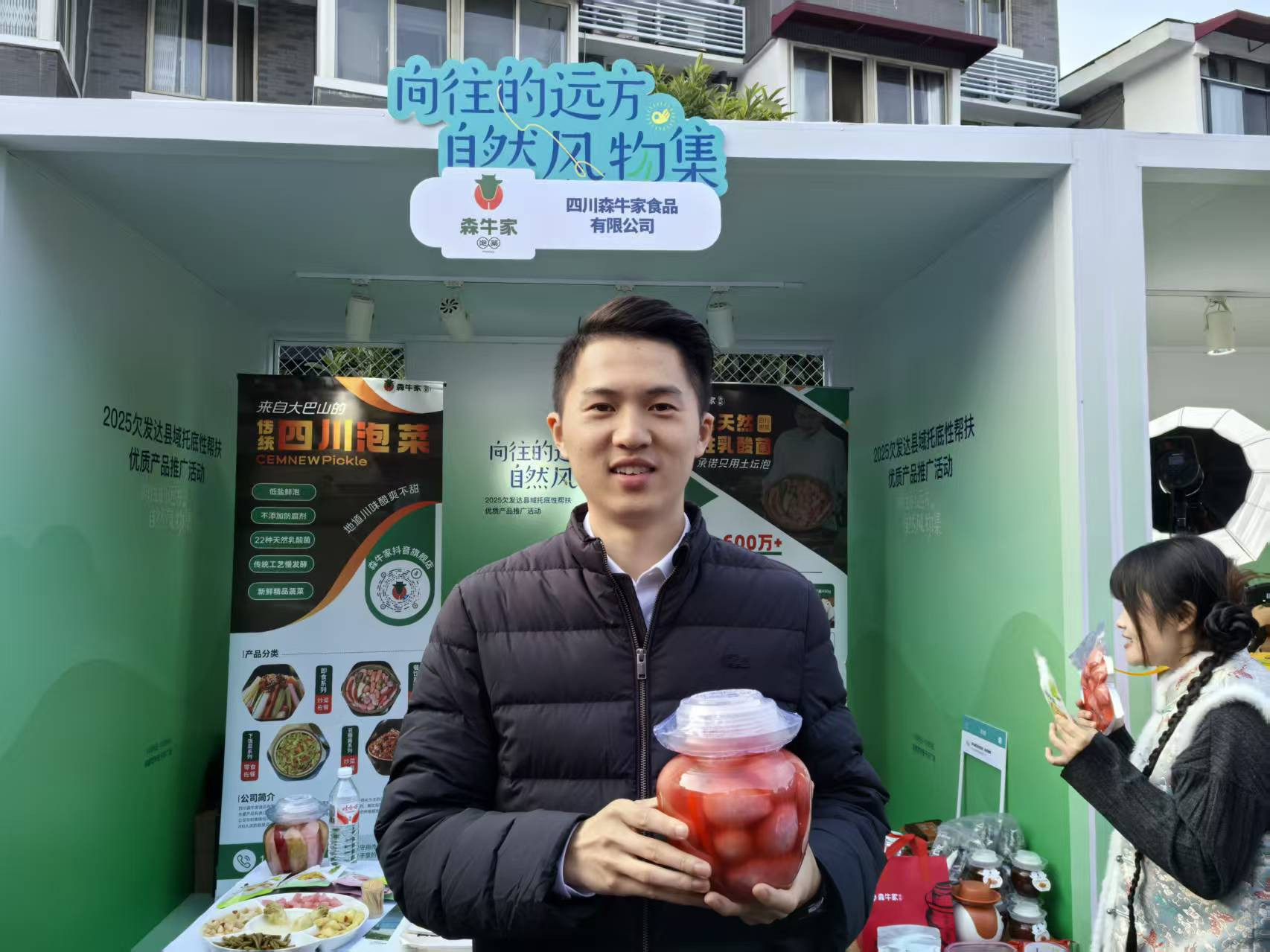旁边展台,来自巴中市巴州区清江镇昆山村村书记助理、经信厅派驻干部杨天培和主播也在直播间,向网友展示森牛家土坛自然发酵泡菜,线上订单的提示音此起彼伏,形成线下体验、线上接单的生动场景。