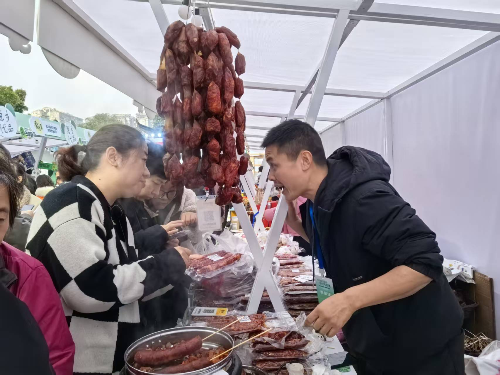 参展商们纷纷表达着兴奋与期待。“没想到我们的黑猪肉手工腊肠这么受欢迎,刚才还有个餐饮连锁的采购经理来谈合作。”巴中市恩阳区一家食品企业的负责人余先生边包装商品边说。来自金川县的雪梨膏展位上,工作人员李先生正忙着给顾客试饮:“很多人第一次知道雪梨还能做成膏,听了我们古法熬制的故事后,都愿意带一瓶回家。”