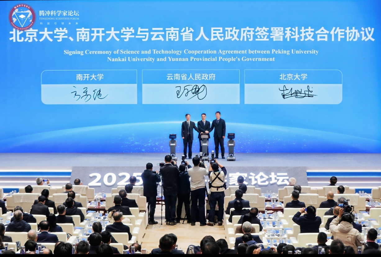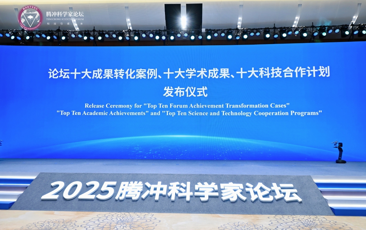 开幕式现场,腾冲科学家论坛主席顾秉林院士、联合主席饶子和院士为2025腾冲科学大奖获奖者潘建伟院士颁奖。会上,宣布首届腾冲青年科学家奖获奖名单,发布十大论坛成果转化案例、十大学术成果、十大科技合作计划和《科技预见与未来愿景2049》报告。